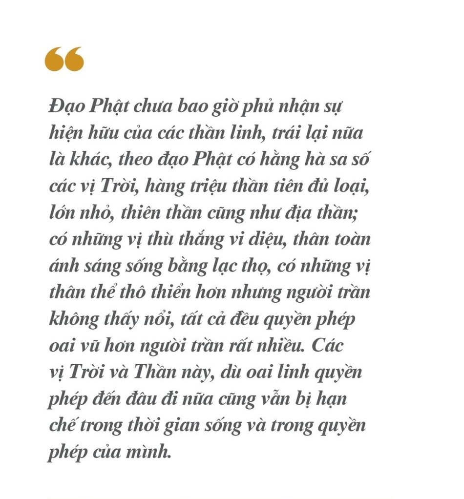 Cần nói cho rõ: Đạo Phật chưa bao giờ phủ nhận sự hiện hữu của các thần linh, trái lại nữa là khác, theo đạo Phật có hằng hà sa số các vị Trời, hàng triệu thần tiên đủ loại, lớn nhỏ, thiên thần cũng như địa thần; có những vị thù thắng vi diệu, thân toàn ánh sáng sống bằng lạc thọ, có những vị thân thể thô thiển hơn nhưng người trần không thấy nổi, tất cả đều quyền phép oai vũ hơn người trần rất nhiều.